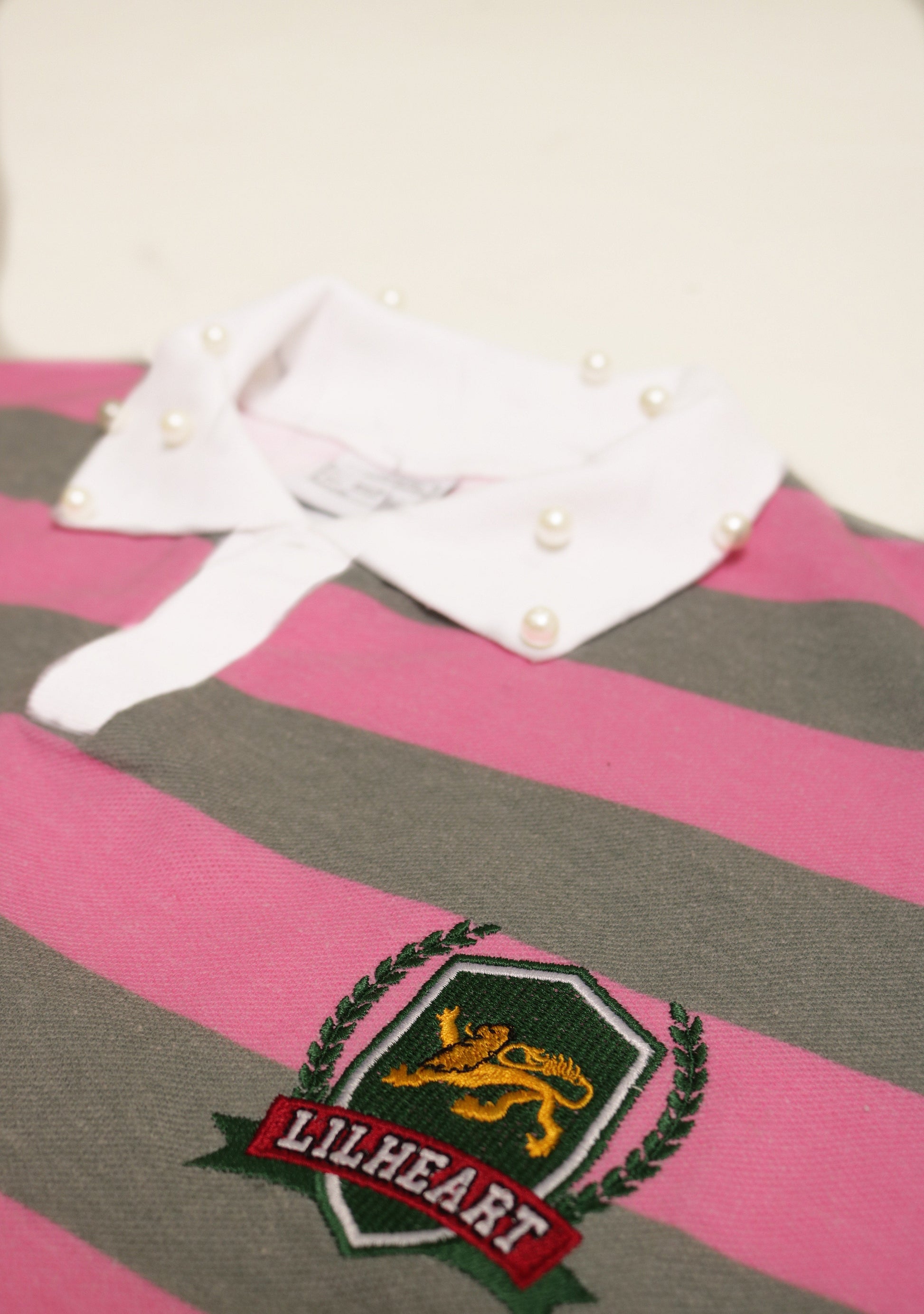 Grey and pink slightly oversized striped t-shirt with pearls adorned on the collar with the embordered Lil Heart Lion crest resting about the left side and detailed leather patchwork on the back side.